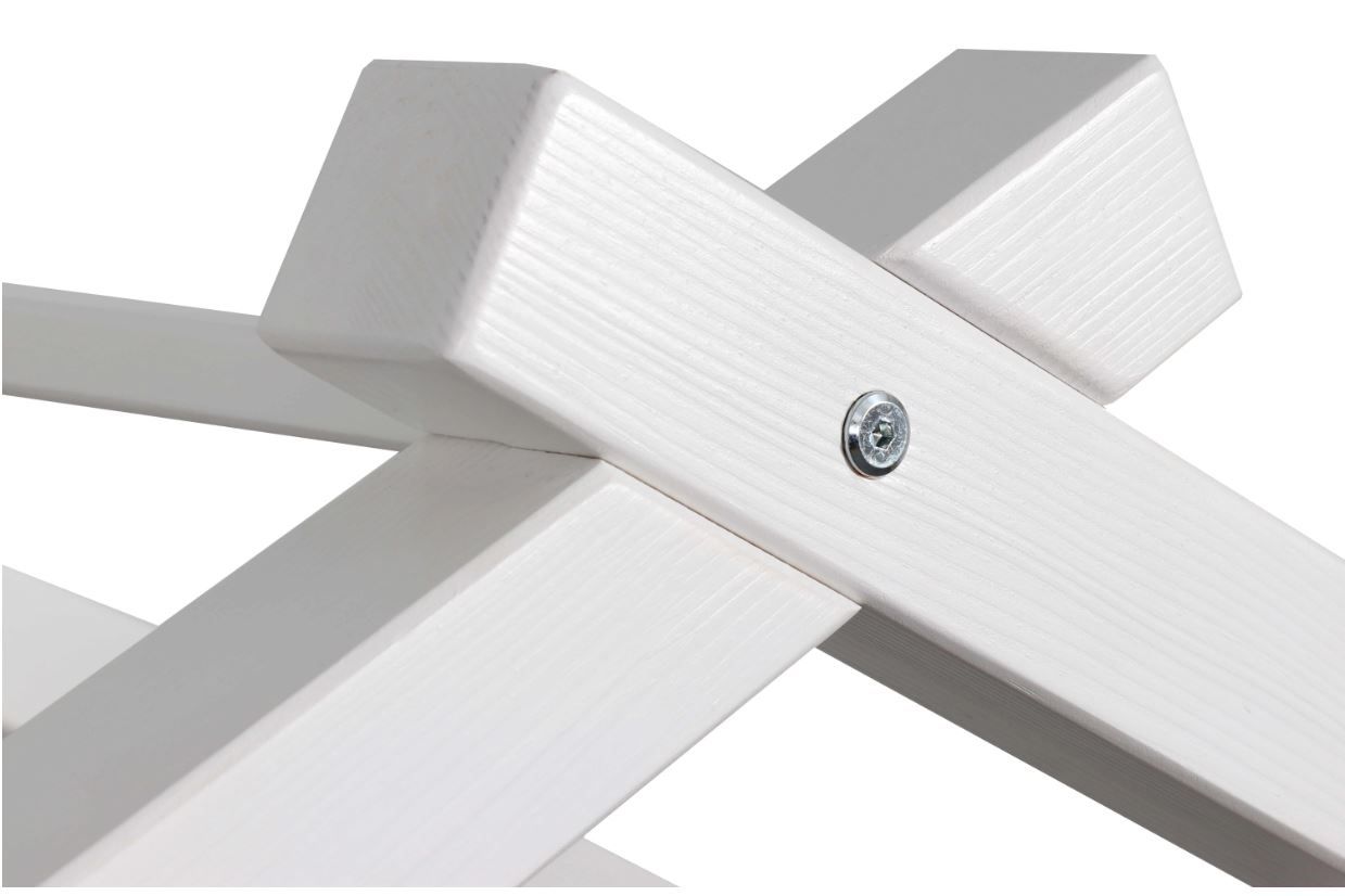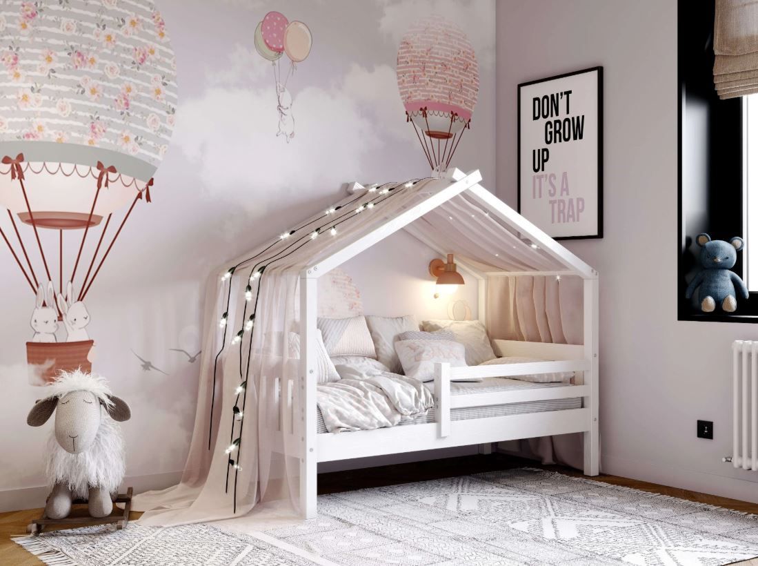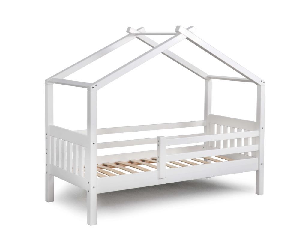 Каркас кровати состоит из поперечных гнутых ламелей, которые обеспечивают поддержку матраса. Головная и ножная части соединены стропилами, которые образуют крышу. Это создаёт ощущение уюта и защищённости, как в домике.