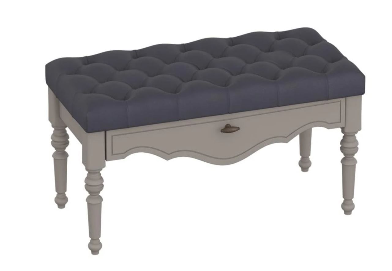 Банкетка оснащена выдвижным ящиком на шариковых направляющих, который позволяет легко и бесшумно доставать вещи. А подушка из экокожи с декоративными утяжками обеспечивает дополнительный комфорт.