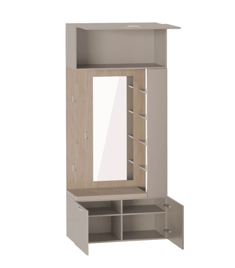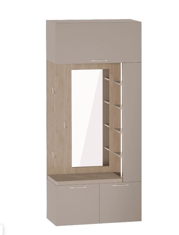 Модуль «Вешалка с зеркалом» изготовлен из ЛДСП цвета «Дуб натуральный светлый/Капучино».