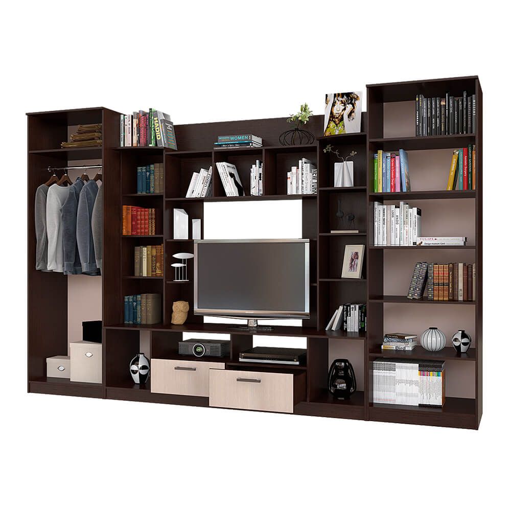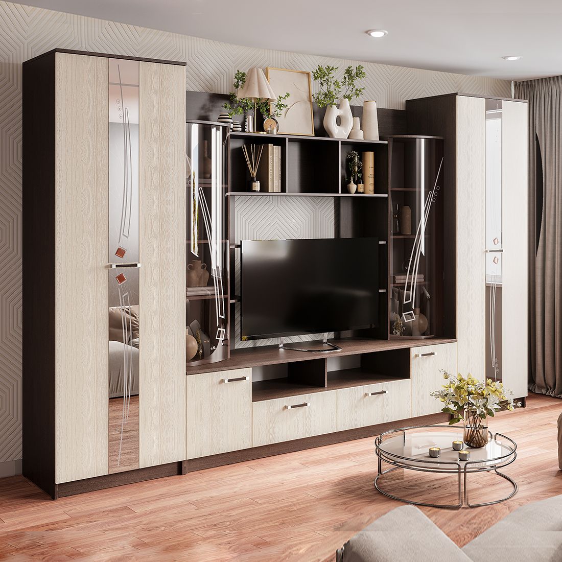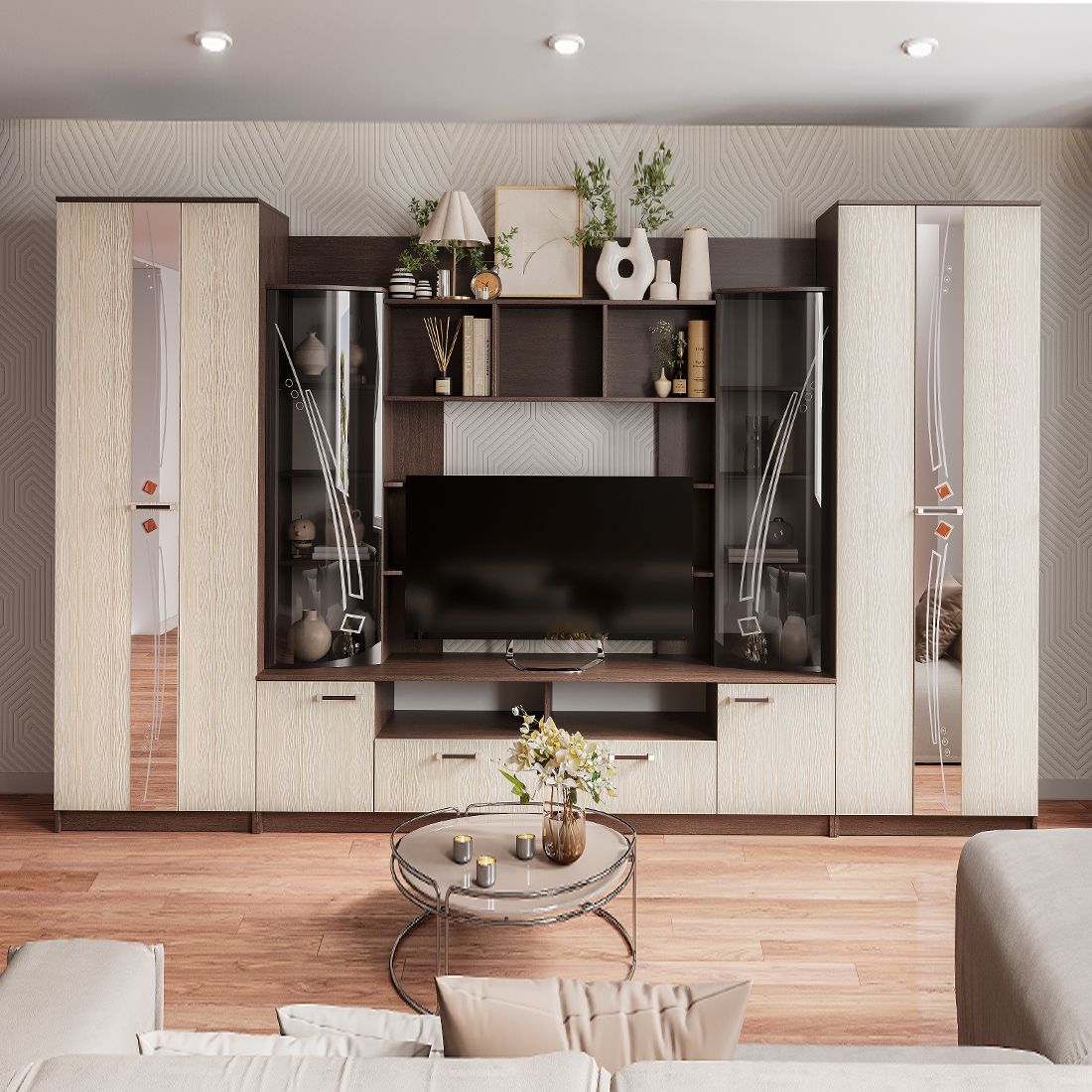 Гостиная «Венеция» — это идеальное место для хранения множества вещей, включая одежду. В этой модели предусмотрены специальные зоны для её размещения. ТВ-зона, выдвижные ящики, ниши для техники и открытые полки органично вписываются в дизайн гостиной, создавая уютную атмосферу.