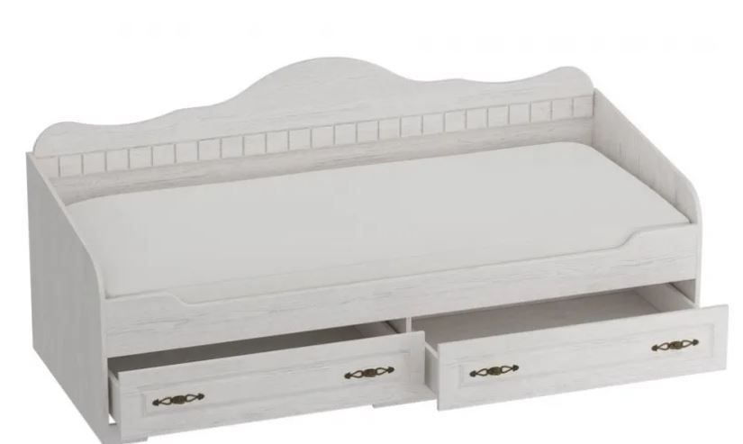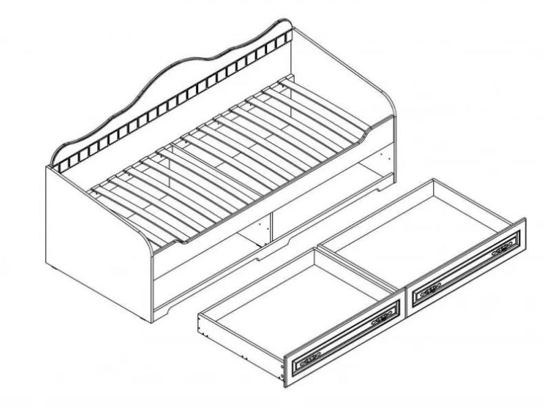 Удобная детская кровать-софа с минималистичным резным декором на фигурной пристенной панели оснащена двумя вместительными выдвижными ящиками для белья под основанием. В комплект кровати входят матрасное основание и выдвижные ящики. Матрас приобретается отдельно.