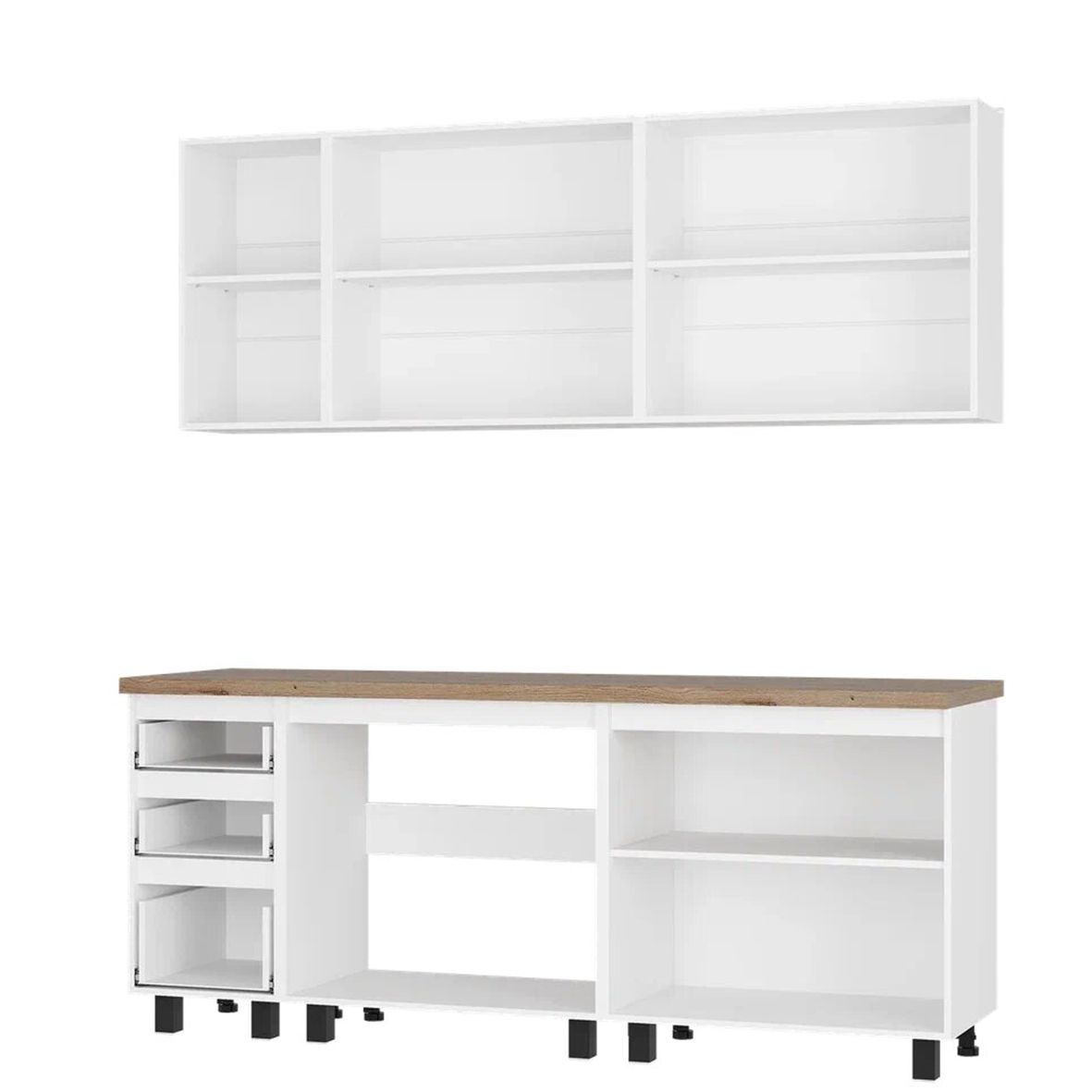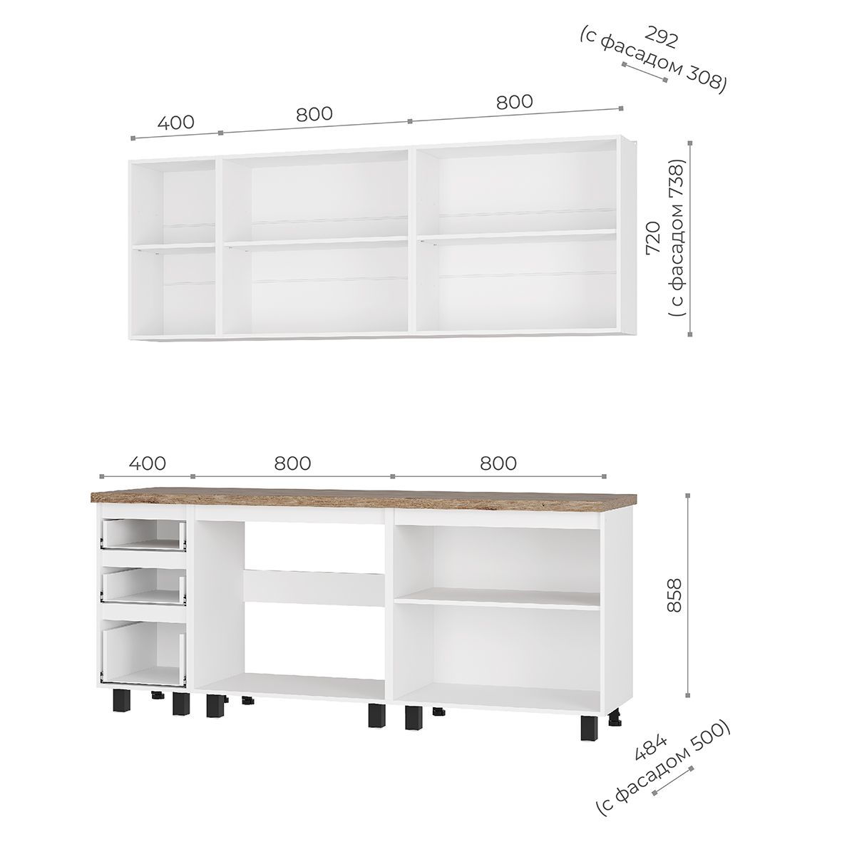 Размеры нижней части: ширина — 2000 мм, высота — 858 мм, глубина — 595 мм. Размеры верхней части: ширина — 2000 мм, высота — 720 мм, глубина — 304 мм.