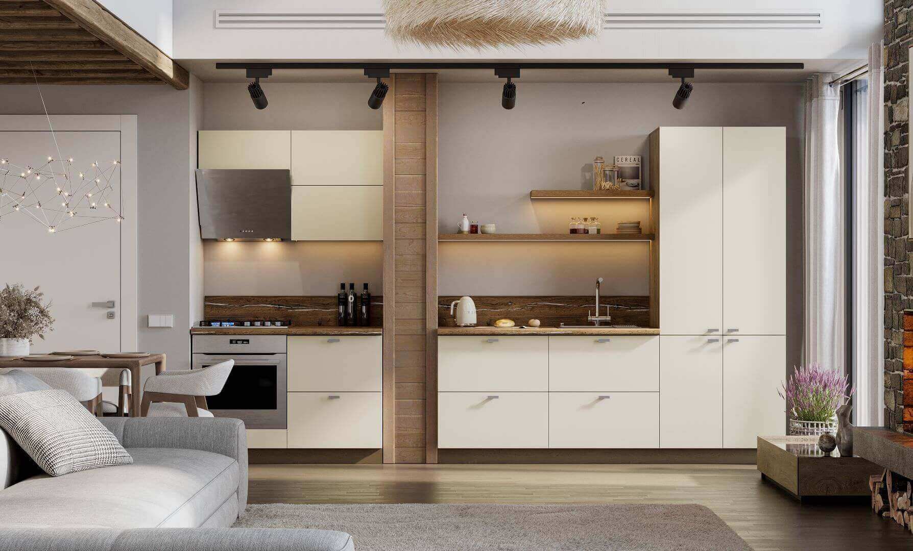 Кухонный гарнитур «Этна алебастр» представляет собой модульную конструкцию, которую можно адаптировать под индивидуальные параметры помещения.