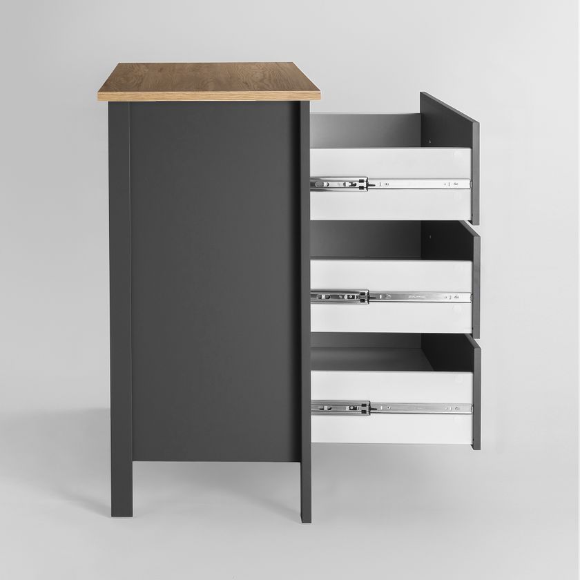Комод из кашированного ДСП отличается высоким качеством. Три вместительных ящика на направляющих полного хода.