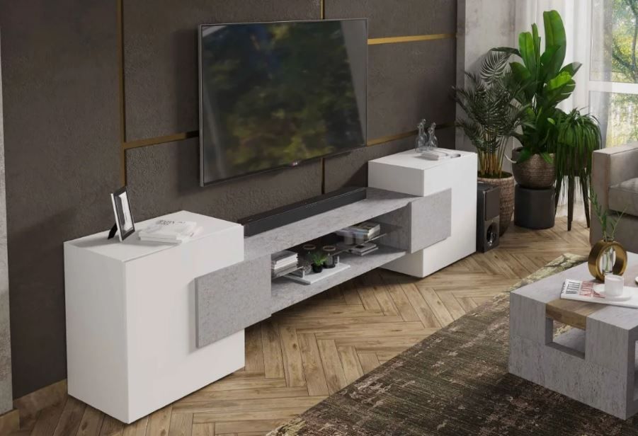 Стильная и функциональная тумба для телевизора «Каскад-4» (2540х610х373) белого цвета с отделкой под светлый бетон.