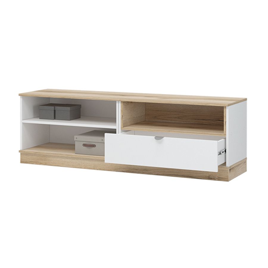 Главной особенностью является наличие двух распашных дверок, которые надежно защищают содержимое от пыли и обеспечивают удобный доступ к внутренним полкам. Дополнительный комфорт обеспечивает выдвижной ящик, идеально подходящий для хранения мелких предметов или пультов дистанционного управления. Этот элемент дизайна делает тумбу не только эстетически привлекательной, но и практичной для повседневного использования.